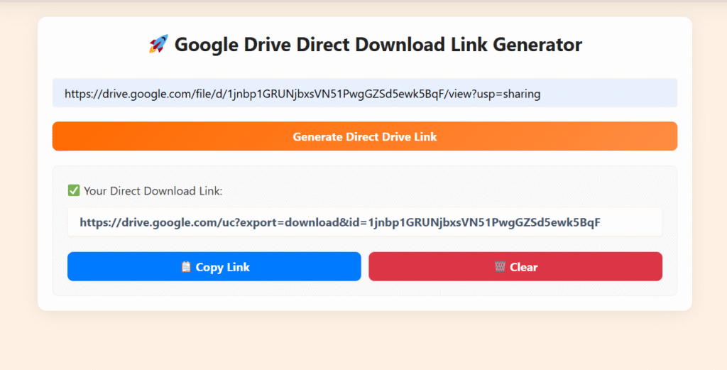A Google Drive Direct Download Link Generator is a simple tool that converts your regular Google Drive share link into a direct download link. Instead of sending people to the preview window, it lets them download the file instantly with just one click.
